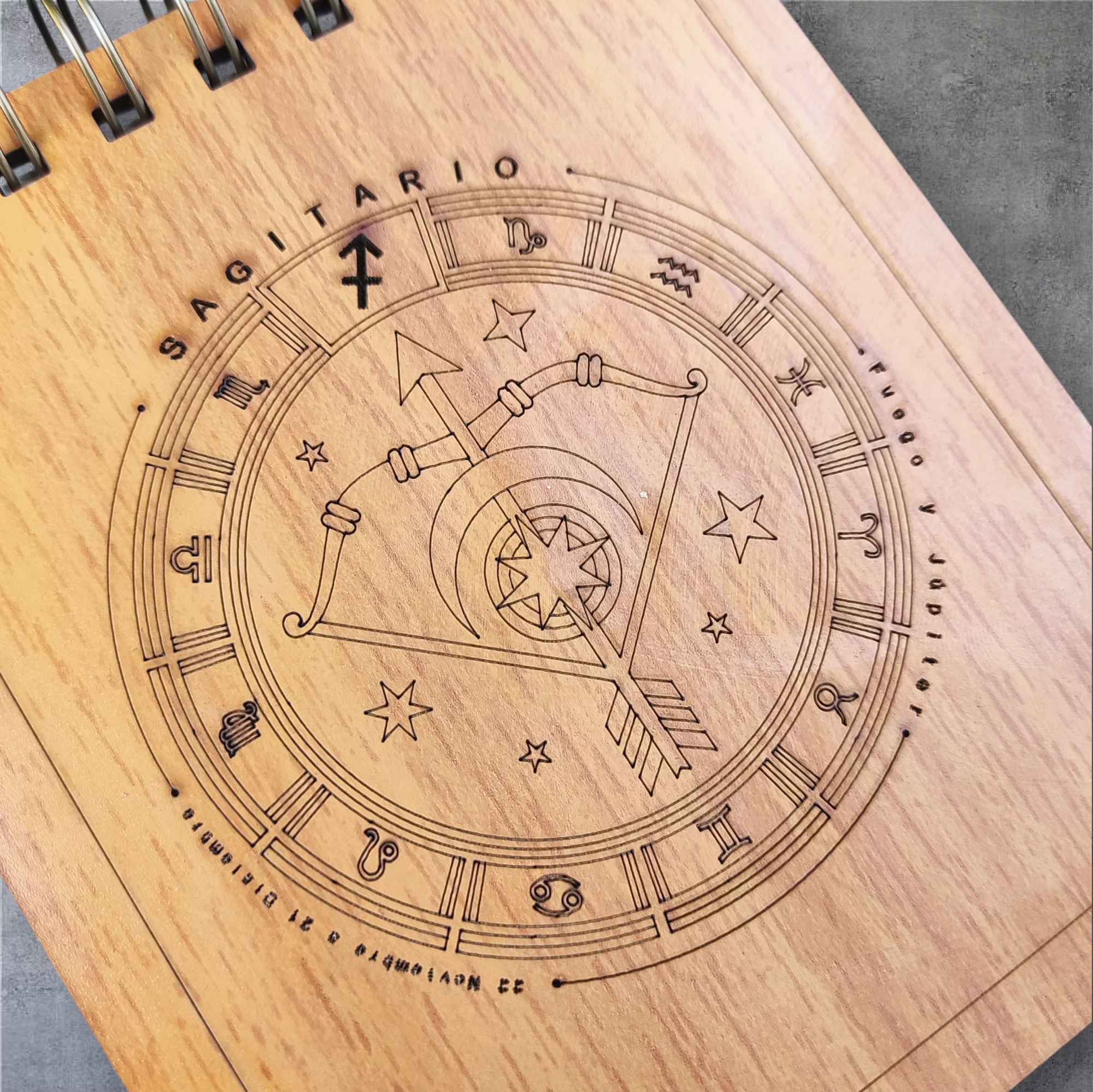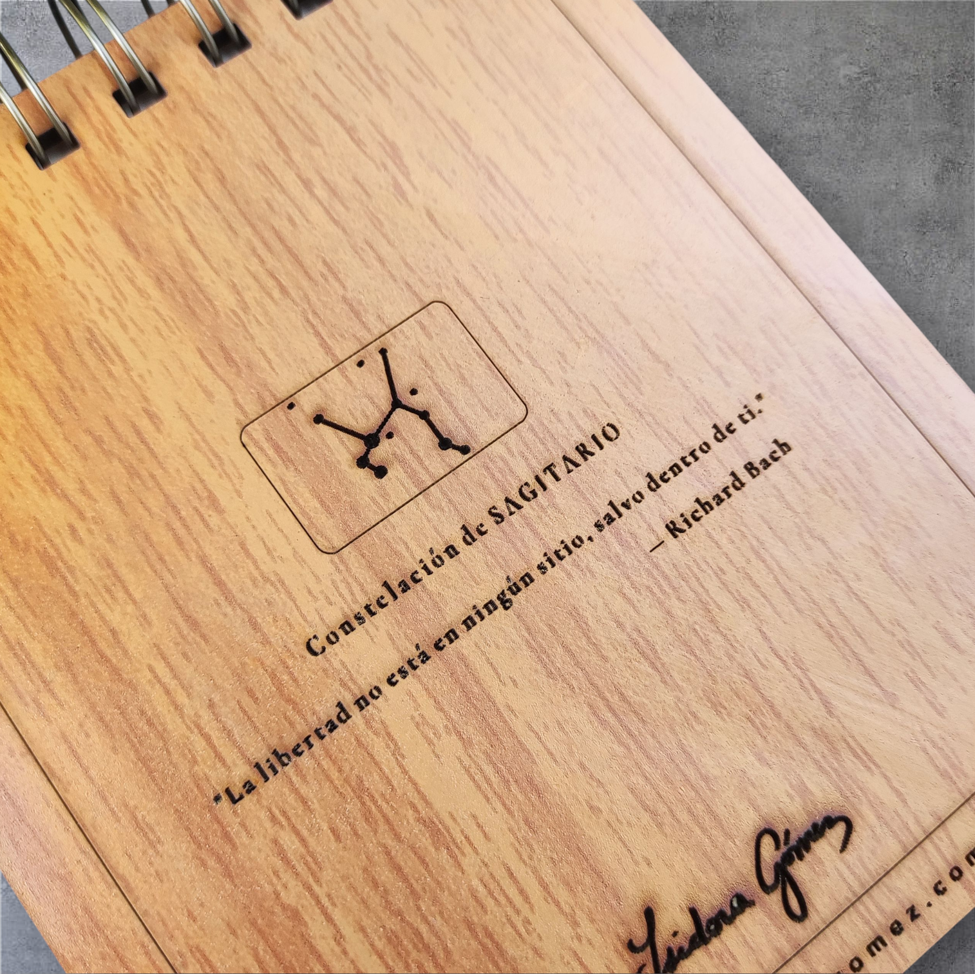 La Libreta Sagitario celebra tu espíritu aventurero con una portada inspirada en el signo y, en el reverso, la constelación de Sagitario para acompañarte en cada meta. Está hecha con papel ecológico de caña de azúcar, suave al tacto y de bajo impacto ambiental, ideal para escribir, dibujar y planear nuevos rumbos.